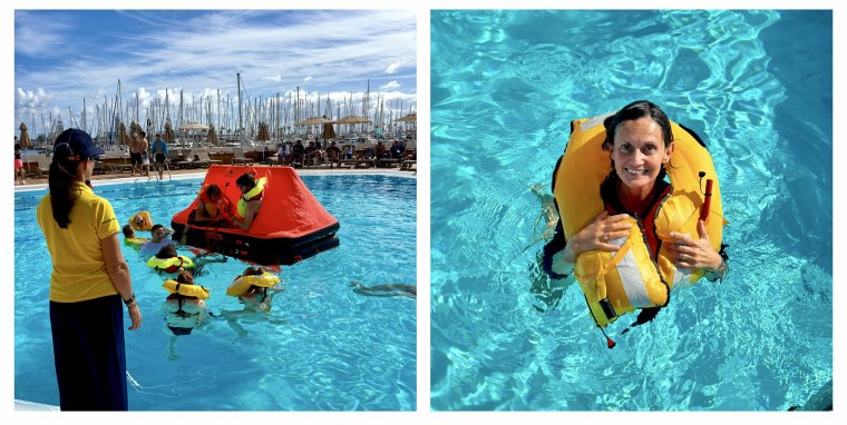 Taking part in the life-raft demonstration. It’s surprisingly difficult to board with an inflated life jacket.